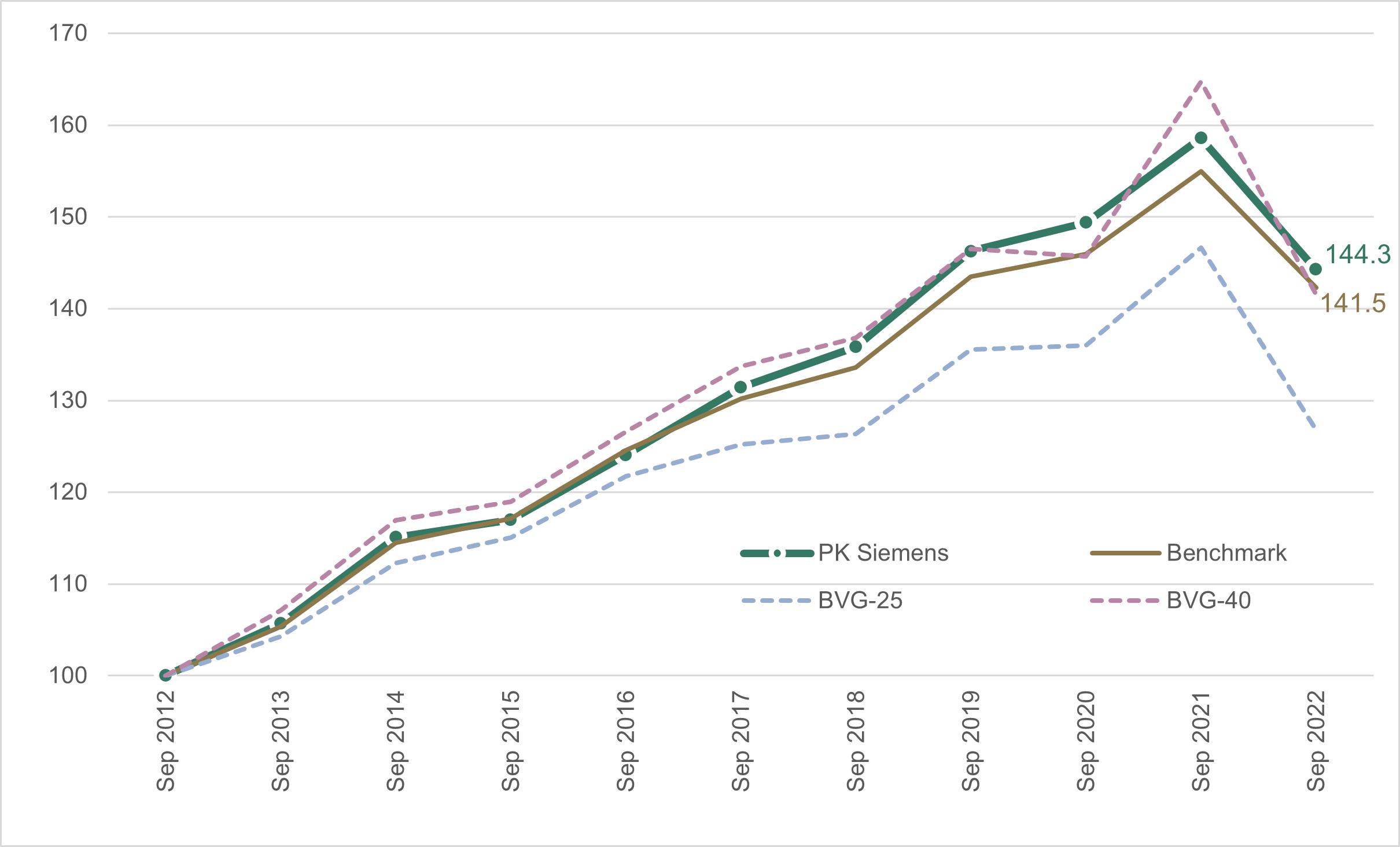 La performance met en évidence l’évolution des valeurs de notre fortune totale, en comparaison avec la stratégie de placement et les indices de référence LPP 25 et LPP 40.