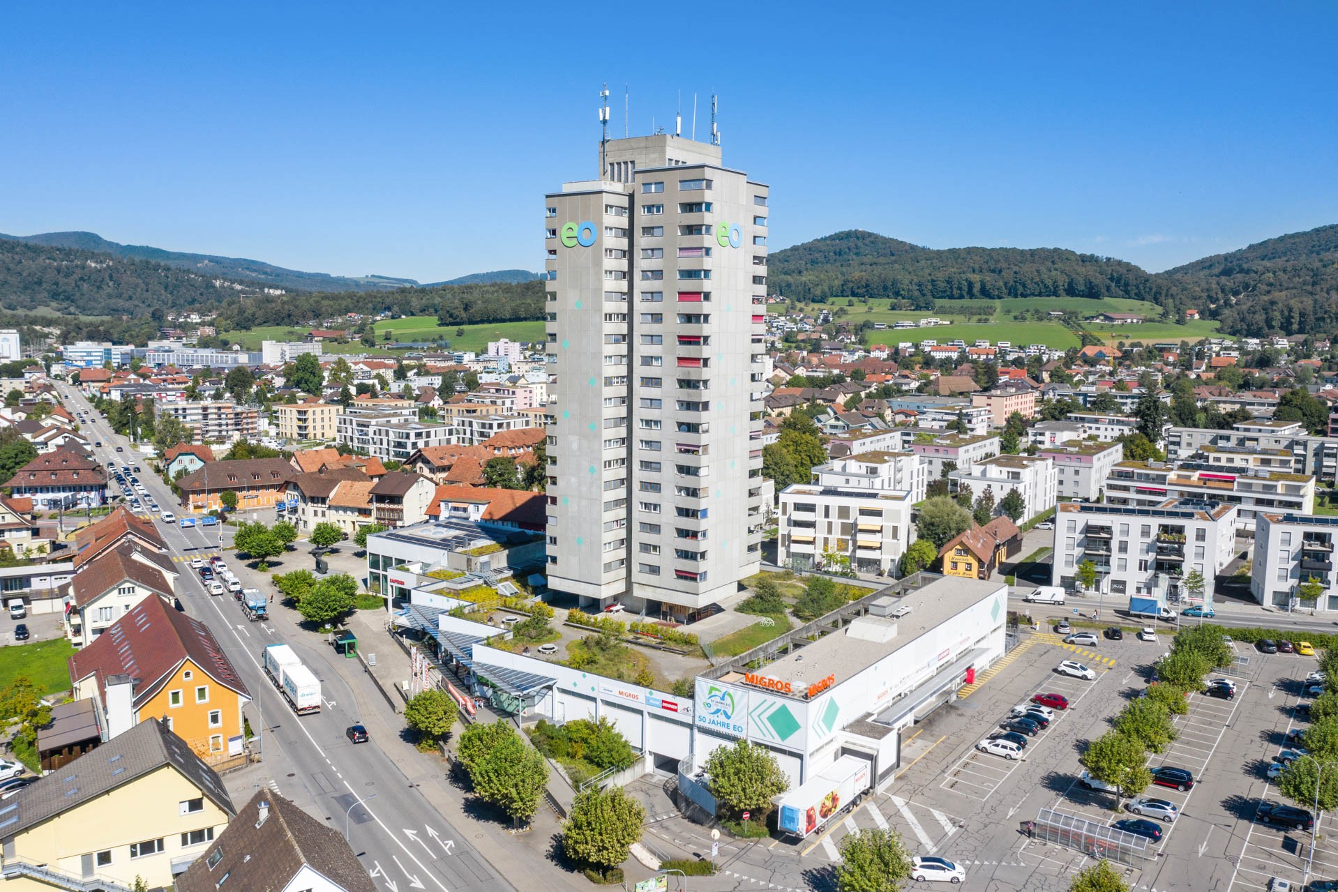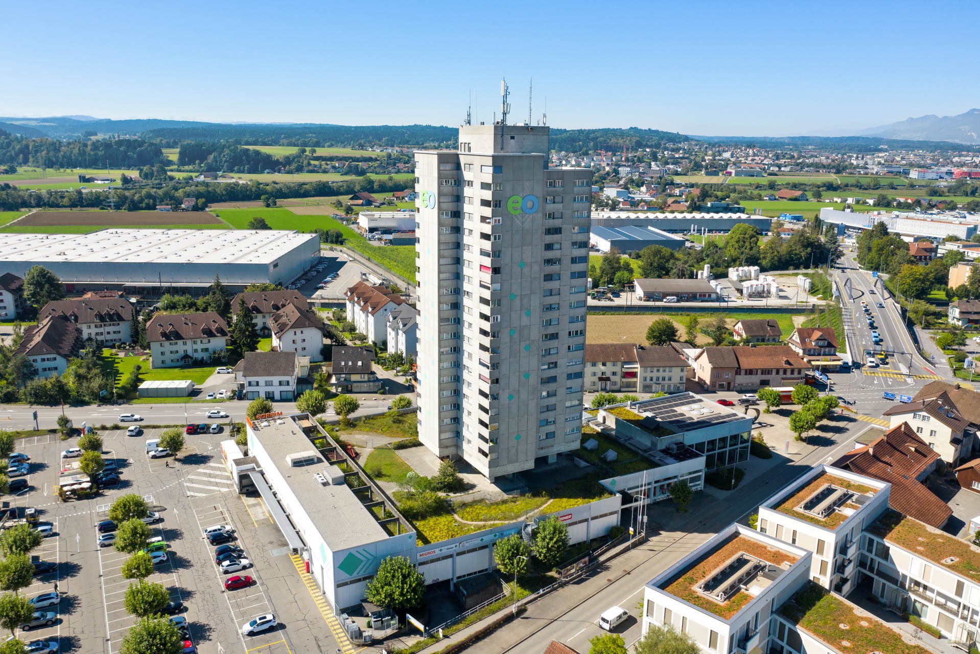 Die Wohn- und Geschäftsliegenschaft liegt am Autobahnkreuz «Wiggertal» im Zentrum von Oftringen. Die Wohnungen bieten teilweise Sicht in den Jura und zum Panorama der Alpen.