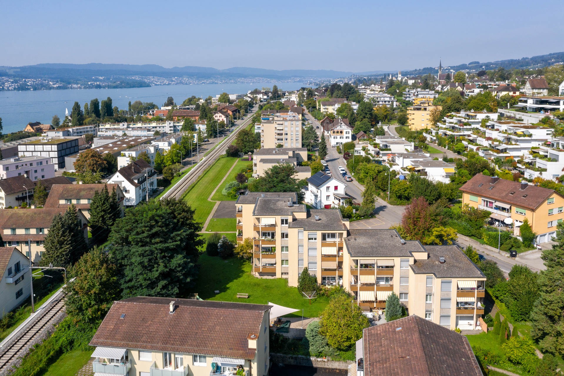 Die Mehrfamilienhäuser befinden sich oberhalb des Zürichsees, umgeben von grosszügigen Grünflächen mit Sitz- und Spielplätzen. Fernsicht auf den Zürichsee und zu den Alpen.