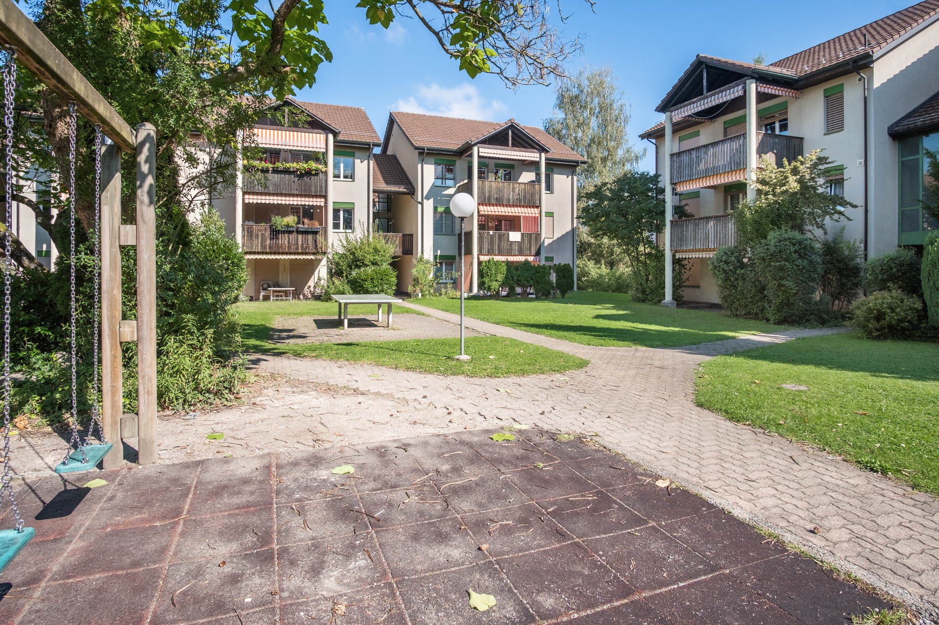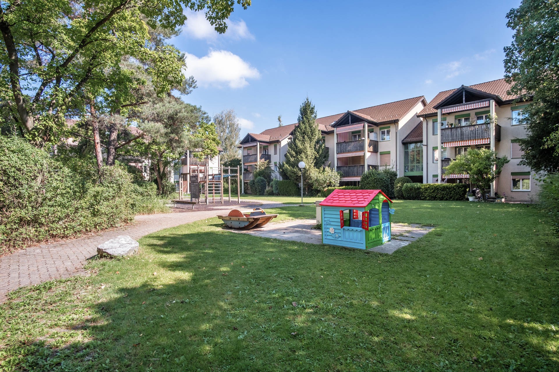 Blockrand-Bebauung mit drei Mehrfamilienhäusern und grosser Grünfläche mit Sitz- und Spielplatz im Zentrum der Überbauung.