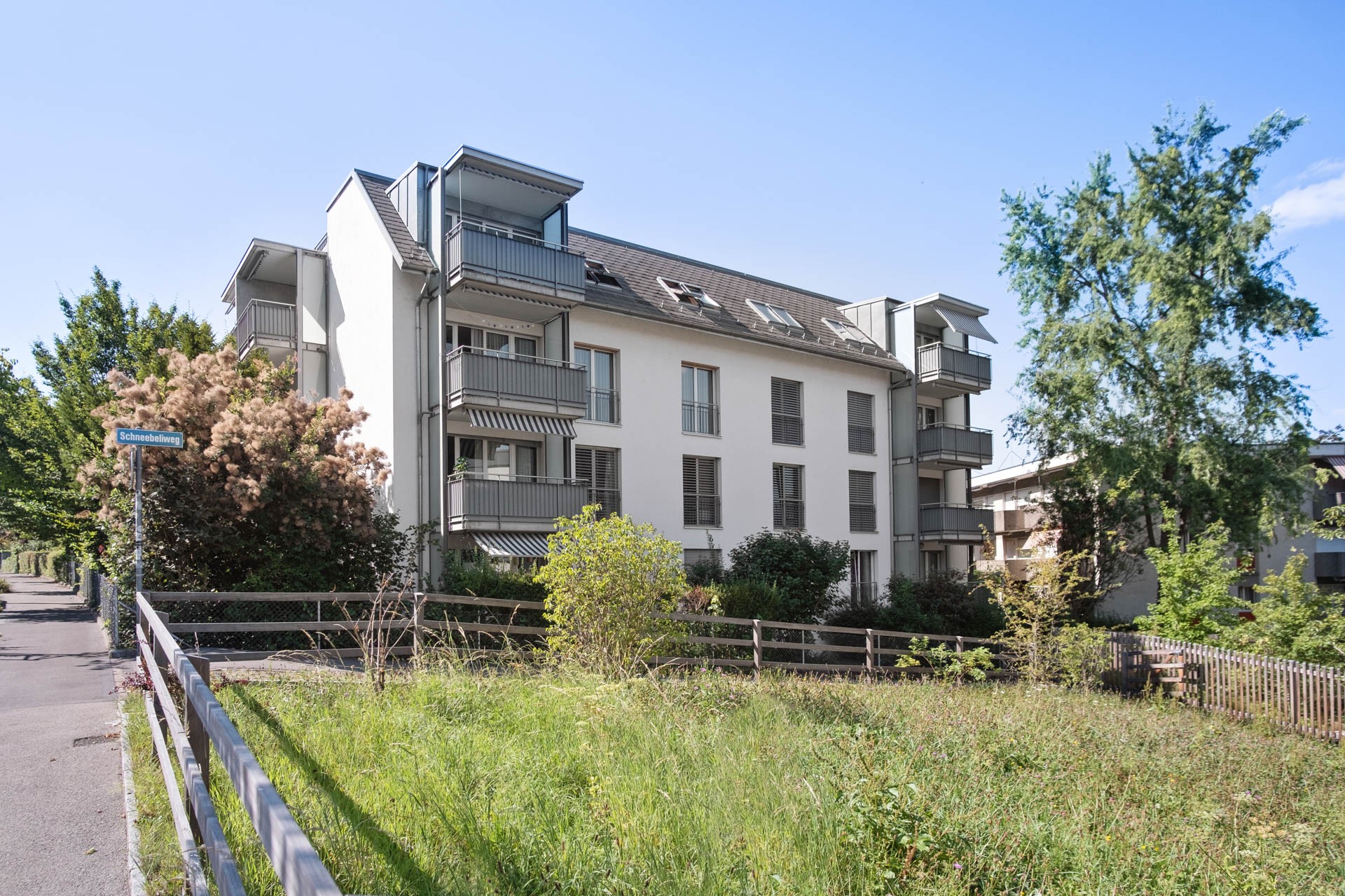 Das Mehrfamilienhaus mit geräumigen Wohnungen liegt am Ende der nicht durchgehenden Feldblumenstrasse; Umschwung mit Grünfläche, Spielplatz und Baumbestand.