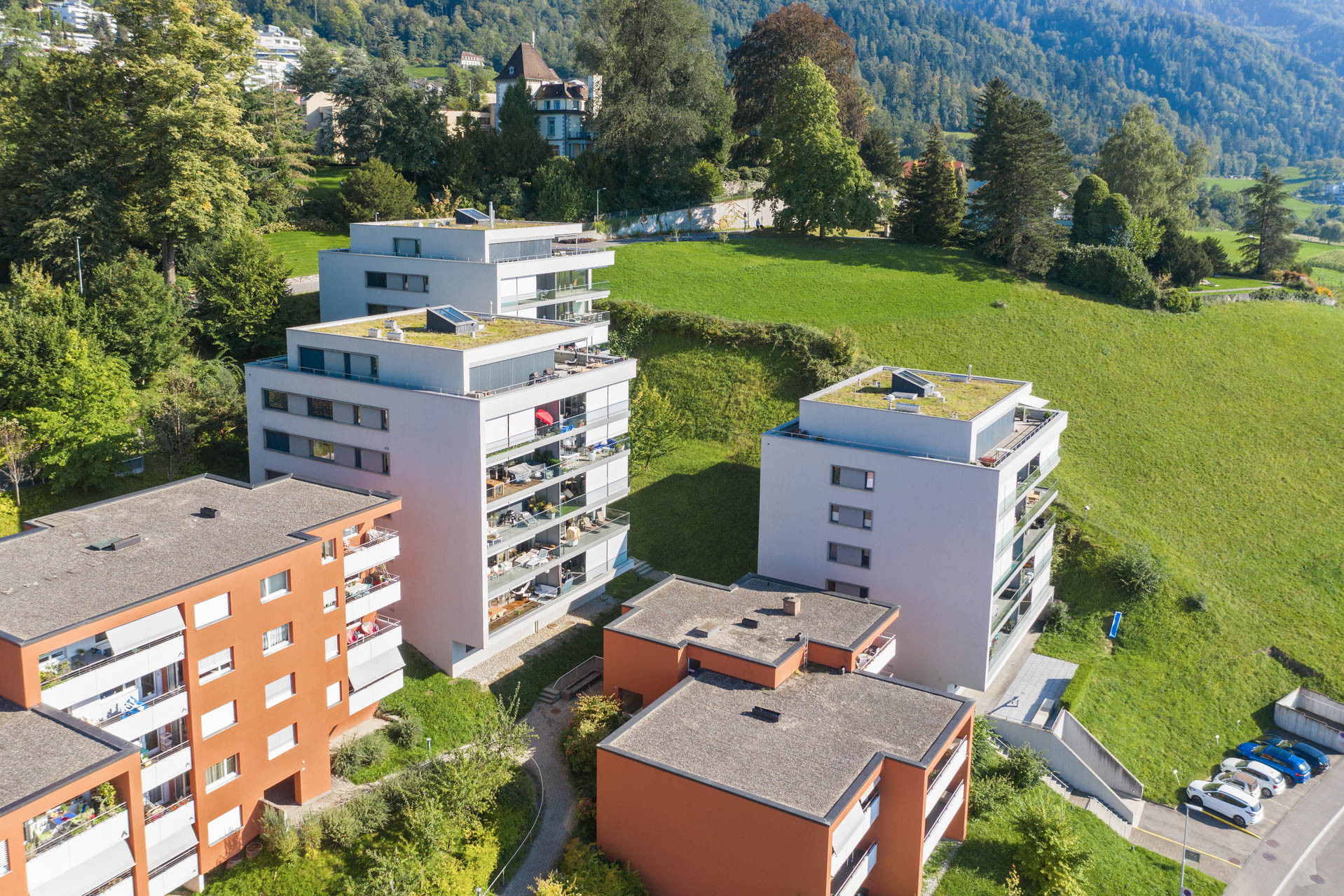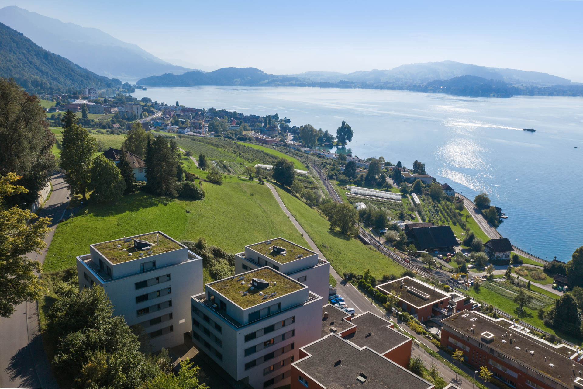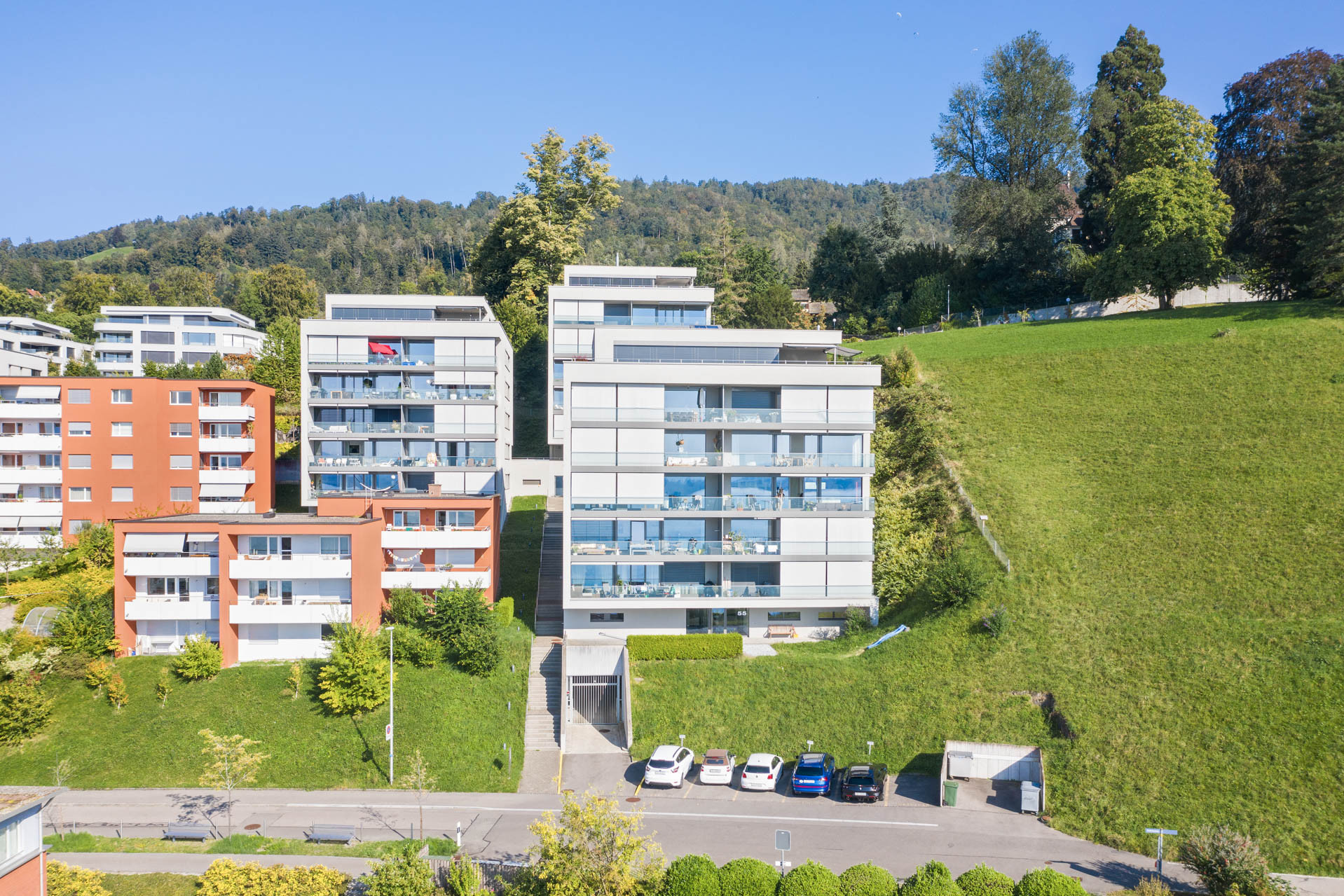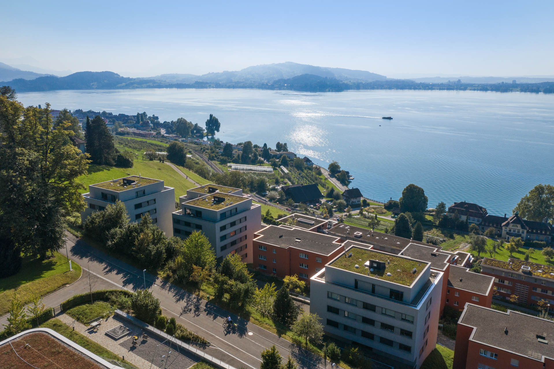 Die vier neuwertigen Terrassenhäuser in der Arealüberbauung Fridbach-Hofstrasse liegen am Westhang des Zugerbergs. Das Areal in offener Siedlungsstruktur bietet Grünflächen, Sitz- und Spielplätze sowie Fernsicht über den Zugersee und zum Panorama der Innerschweizer-Alpen.